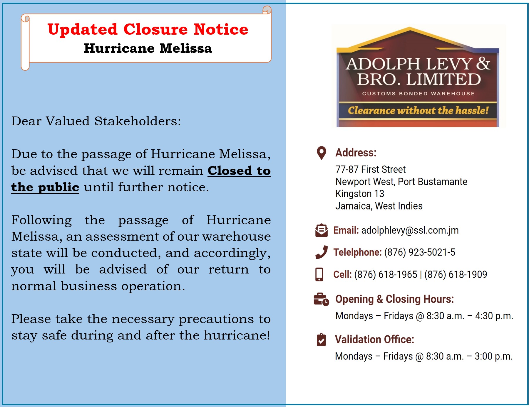 Adolph Levy & Bro. Ltd. (ALB), which has been in operation for over 30 years, is a privately owned Customs Bonded Warehouse strategically located close to Jamaica’s Main Port of Entry.